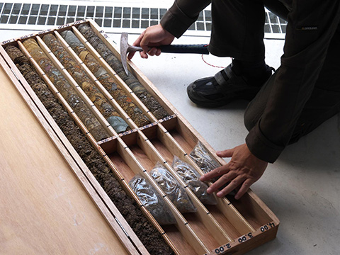 地質調査グループでは、地形や地表面の地質を現地観察することで地盤の連続性を把握する踏査に加えて、ボーリング調査(ボーリング機械により地盤のサンプルを掘削採取すること)等を行います。